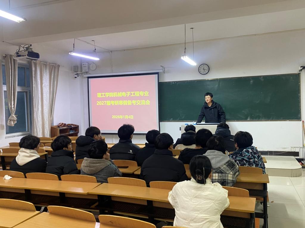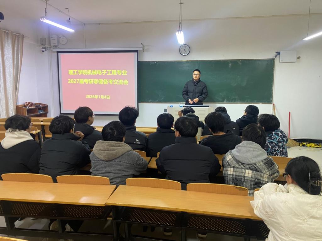 为解决考研学生的需求与困惑,激励同学们在寒假积极备考,持续推动学生考研工作进行,1月4日晚,理工学院在理工楼302召开机械电子工程专业2027届考研寒假备考交流会。会议由机电专业考研指导老师周梦主持,机电教研室主任周敬乐出席会议,特邀22机电本01程蓁、赵岩嵩、张耀森学长分享考研经历,2027届机电专业考研学生参加此次会议。
