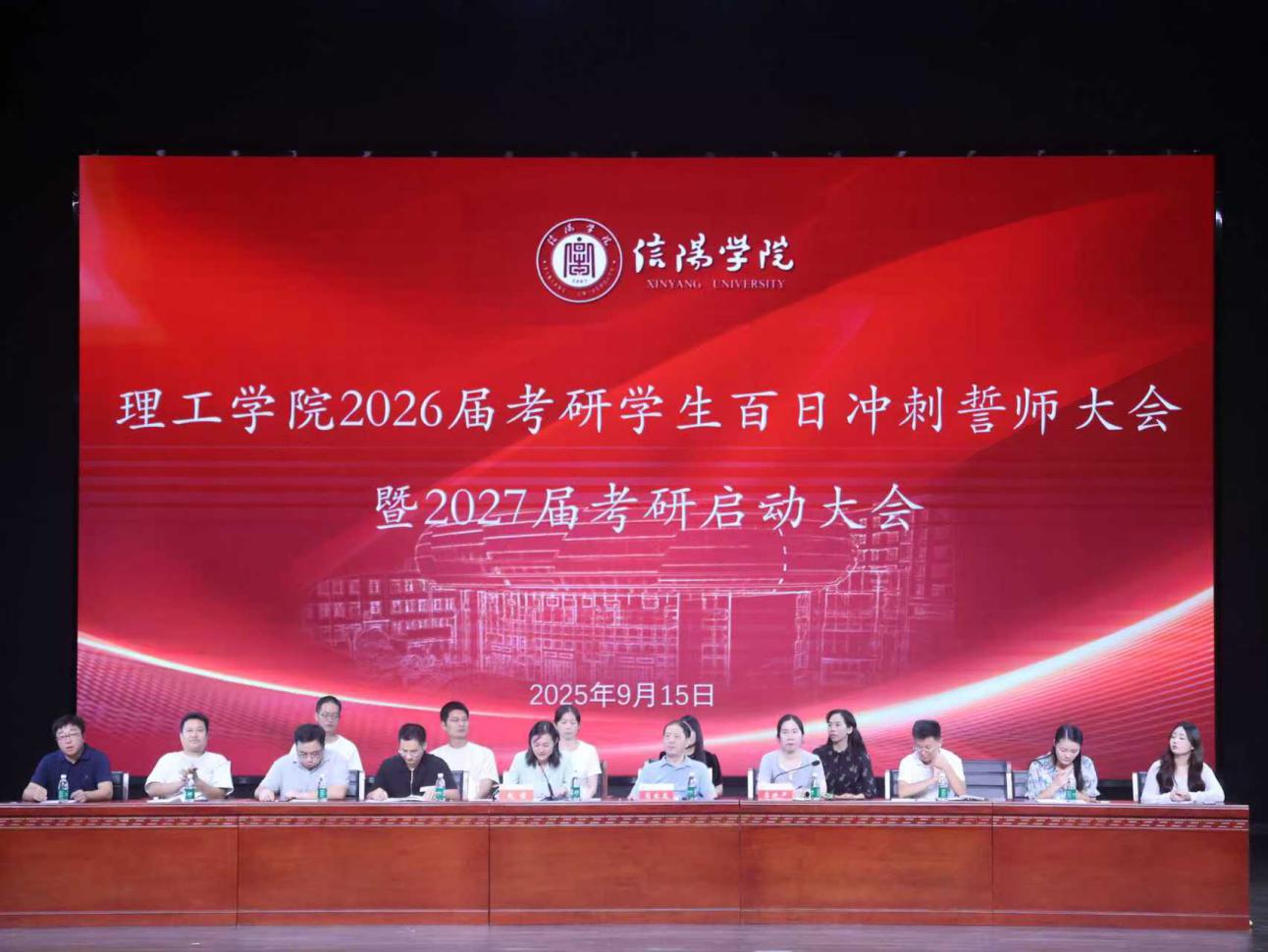时维九月,金风拂面。9月15日晚,理工学院于信阳学院音乐厅隆重举行2026届考研学生百日冲刺誓师大会暨2027届考研启动大会。理工学院院长肖生发、党总支书记赵佳、教学副院长李晓严、学工秘书杨晓杰,各专业考研指导老师、教研室主任、全体辅导员,2026届考研学子、2027届拟考研学子共同参会,见证这一励志时刻。此次会议由赵佳主持。