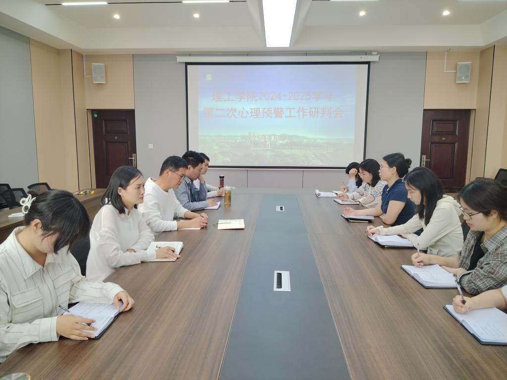 4月28日下午,理工学院在理工楼201会议室召开2024-2025学年第二学期第二次心理预警工作研判会,党总支书记赵佳出席会议,全体辅导员参加会议,会议由心理辅导站站长甘玉锋主持。