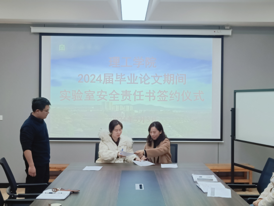 最后,化学教研室主任黄艳伟和生物教研室主任高进勇分别跟李晓严签署了毕业论文期间实验室安全责任承诺书。