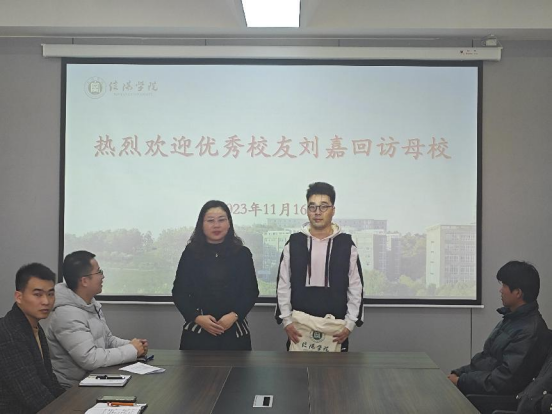 最后张红梅书记做了总结,她对校友长期以来对学校和院系的关心和支持表达了感谢,她强调,校友是母校发展的见证者,也是母校发展的推动者,是学校建设发展最可依靠的力量和最宝贵的资源,近年来学校高度重视校友工作,牵挂校友发展,将以本次会议为契机,逐步推进校友会筹备事宜,进一步为校友搭建平台,尽心尽力做好校友服务工作,同时也希望广大校友时常回访母校。最后张红梅书记为刘嘉颁发校庆纪念品,并再次对校友回访表示感谢。