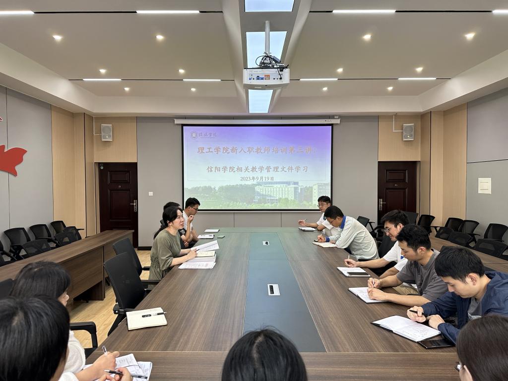 9月19日下午,理工学院2023年新入职青年教师培训第三讲在理工楼201会议室举行,讲座由理工学院副院长李晓严主讲。本次会议旨在通过对信阳学院相关教学管理文件的解读,让新进教师更加深入了解教学相关规章制度、考核办法、奖惩措施以及教学科研的相关政策等。