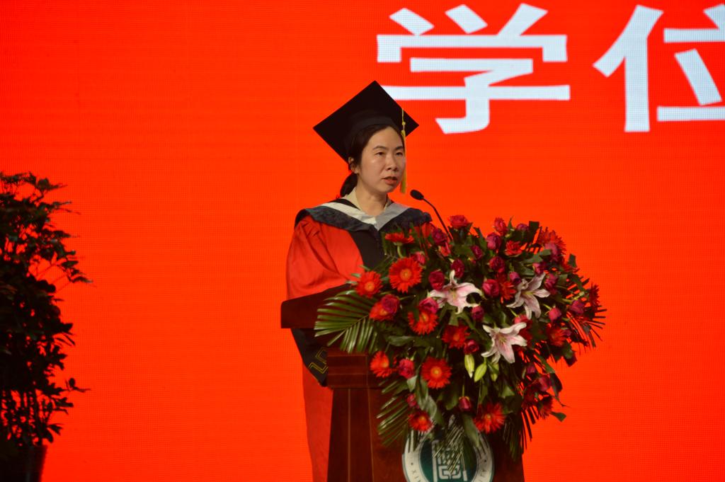 教师代表董玉静博士发言,她对2023届毕业生表示热烈的祝贺,嘱咐每一位毕业生保持顽强的意志、坚韧不拔的精神、积极乐观的态度,要大胆地去尝试,执着地去坚持,果断地去放弃,在不断学习,不断积累的过程中强大自己。