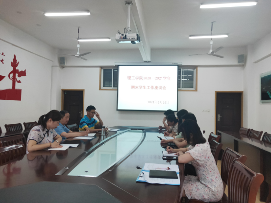 6月16日上午,理工学院在理工楼201会议室召开2020-2021学年期末学生工作座谈会。理工学院院长肖生发、党总支副书记张红梅、学工秘书杨晓杰及全体辅导员教师参加会议。