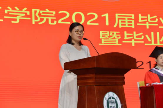 教师代表张秋平博士发言,她对2021届毕业生表示热烈的祝贺,嘱咐每一位毕业生要学会感恩、心存敬畏、保持自信、勇于担当,在今后的人生道路上铭记“天下兴亡,匹夫有责”的古训。