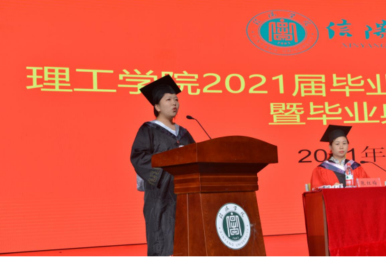 2021届毕业生代表吕荫发言,她回忆了大学四年的美好时光,表达了对母校以及对师长的感谢,将继续秉承信院校训,以母校为荣,用实际行动为母校增光。在校生代表杜鑫磊发言,他向取得学位的学长学姐们送上了祝福,祝福他们勇往直前追求更高更好的未来;同时表示他们也会向学长学姐学习,学会学习、坚持学习,让学习成为自己的责任,成就美好未来。
