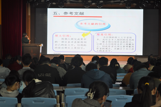 3月23日下午,理工学院在大学生活动中心举行毕业论文(设计)写作讲座。理工学院院长肖生发、党总支副书记张红梅、教学副院长李晓严、全体教师和2021届毕业生聆听了报告。讲座由张秋平博士主讲,赵丹主持。