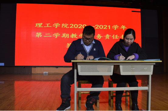讲座结束后,理工学院举行了2020-2021学年第二学期教学任务责任书签订仪式。地理科学、化学、生物科学、机械电子工程、汽车工程等教研室主任魏新玲、张秋平、高进勇、曹国廷、王思满等轮番上台同李晓严签订了教学任务责任书。