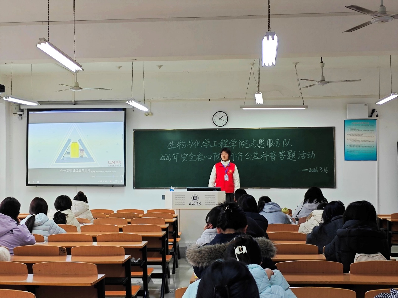为普及防震减灾科学知识,提升学生应急避险与自救互救能力,3月16日,生物与化学工程学院志愿服务队组织开展了“安全在心,防震于行”公益科普宣讲题活动。本次活动采取“集中观影学习—现场互动答题”相结合的方式。