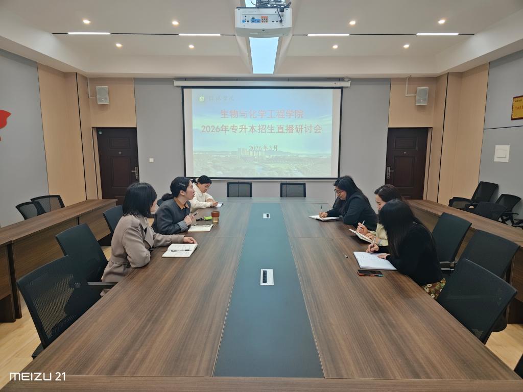 为进一步提升招生宣传质量,彰显学院办学特色,3月30日下午,生物与化学工程学院在理工楼201会议室召开了2026年专升本招生直播研讨会。党总支书记赵佳、教学副院长李晓严、负责招生的老师和辅导员参加会议。