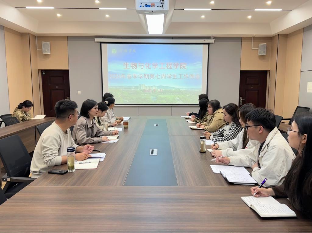 4月13日,生物与化学工程学院召开 2026 年春季学期第七周学生工作例会,传达学校就业工作相关会议精神,统筹安排近期学生工作。学院党总支书记赵佳、副书记邓先强及全体辅导员参加会议。