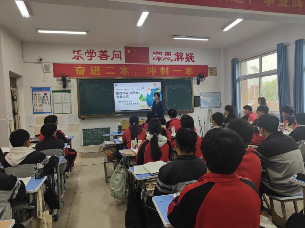为更好展示学院办学特色与育人成果,吸引优质生源,深化与优秀生源基地的交流,4月14日,我院地理科学专业招生宣传团队走进信阳市新时代高级中学,面向高三年级学子开展了一场精准、生动的招生宣传与咨询活动。