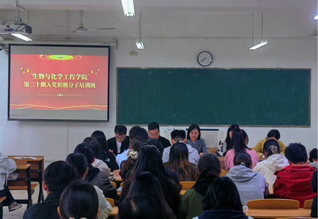 为深入学习贯彻习近平新时代中国特色社会主义思想,加强对入党积极分子的培养教育,4月21日中午,生物与化学工程学院第二十期入党积极分子培训班开班仪式在理工楼506教室举行。学院党总支书记赵佳、副书记邓先强、团总支书记杨康强、组织员兼学生党支部书记王雨茜出席会议,全体学员参会。仪式由王雨茜主持。