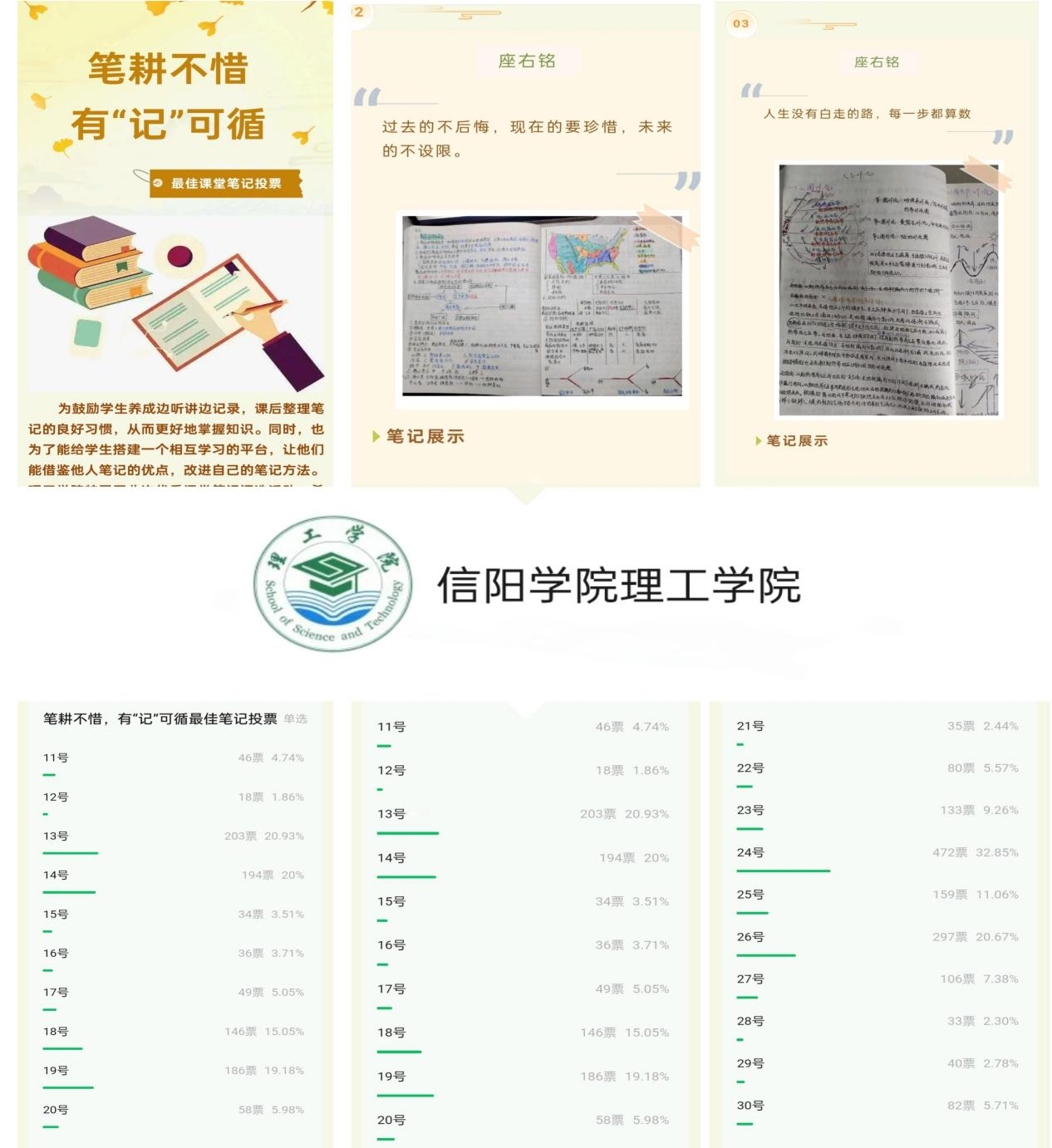 秉持公平、公正、公开的原则,由各班级负责人奖参赛作品汇总至学习部负责人处,依据笔记的完整性、条理性、准确性以及创新性等标准进行严格筛选,经过初选、复选最终30份优秀课堂笔记进入决赛。决赛采用线上投票方式,由青年融媒体中心将参赛选手作品制以推文的形式发送至信阳学院理工学院公众号,全体师生采取匿名投票的方式共同评选出一、二、三等奖。