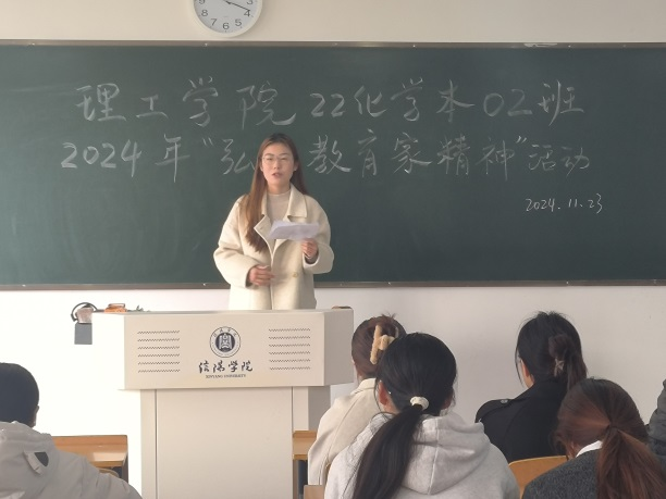 强国必先强教,强教必先强师。为激发广大青年学生坚定理想信念,弘扬教育家精神,探索教育规律,创新教学方法,提升专业素养,厚植教育情怀,理工学院化学专业于12月6日,在人文楼108教室举办了2024年“弘扬教育家精神,厚植教育情怀”主题演讲比赛。此次比赛由化学教研室张秋平老师组织,22化学本03班姚家豪同学主持,化学教研室马艳梅、吴艳玲、张艺和张瑞老师担任评委,化学专业150名学生观看了比赛。