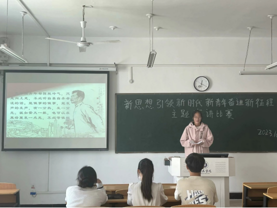 新时代呼唤新思想,新思想引领新青年,新青年奋进新征程。张建阁慷慨激昂地陈词道,我国发展正处于新的历史发展阶段,更要把握时代机遇,以昂扬的姿态大步向前走去。温佳振掷地有声的讲道,新时代的中国青年要以实现中华民族伟大复兴为己任,增强做中国人的志气、骨气和底气,不负时代,不负韶华,不负党和人民的殷切期望!我们作为新青年,应成为国家的脊梁、时代的先锋。以实际行动践行新时代中国特色社会思想,以奋斗在新的征程中取得更加辉煌的成就。