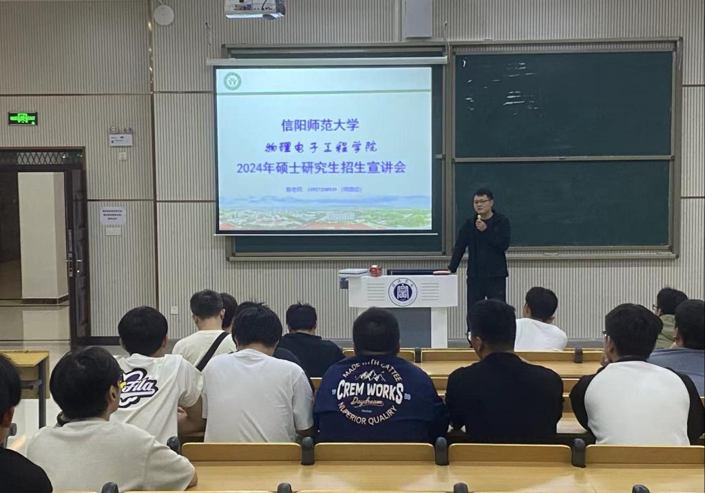 陈老师从学校及学院概况、师资队伍、学科方向、科学研究、人才培养等方面进行了详细的讲解;其后着重介绍了近年来所培养研究生的就业去向,展示了物电学院强大的研究生培养实力;同时鼓励同学们积极报考信阳师范大学研究生。最后,信阳学院优秀毕业生桑小飞、邓文明同学结合个人经验分别就报考专业及备考情况和同学们进行分享交流。