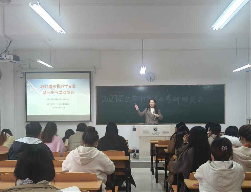 为激发2027届生物科学专业学生考研热情,明确备考方向,营造积极向上的学习氛围,生物科学教研室于2025年10月24日下午在理工楼402室开展2027届生物科学专业考研动员会。参会的有2023级生物科学专业全体学生。本次动员会由生物科学教研室余倩云老师主持。