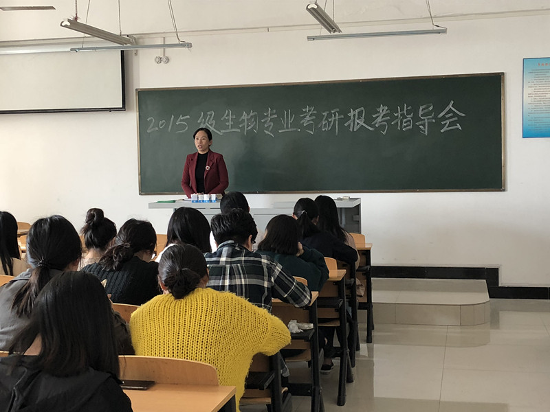 10月19日下午,生物专业教师在理工楼505教室为2015级生物专业考研学生召开了考研志愿填报指导会。指导会由生物教研室主任高进勇老师主持,生物教研室全体教师和即将进入考场的60多名考研学生参加了指导会。