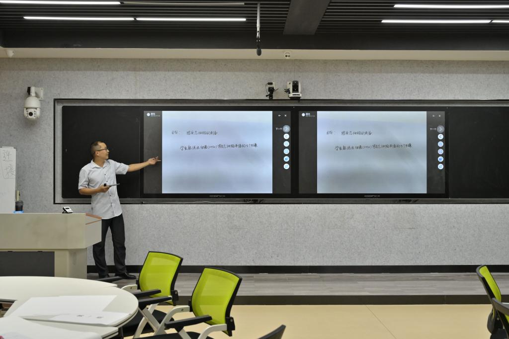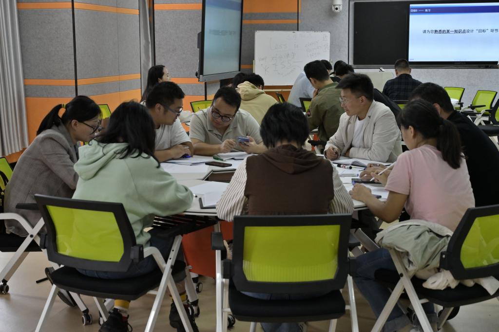 郭一鸣教授以“何为有效教学?”开场,详细讲解了BOPPPS有效教学结构中的导入(Bridge-in)、目标(Objective)、课前测试(Pre-assesment)、参与式学习(Participatorylearing)、课后测试(Post-assessment)、课堂小结(Summary)六个模组以及操作要领。郭教授强调,BOPPPS有效教学结构的各个环节相互协作配合,核心理念是以学生为中心,关注全部学生的学习进度和反馈,重视知识的自我构建,最终达成有效学习。讲座过程中,郭教授利用雨课堂进行了实时讨论、投票答题、随机点名、拍照上传等信息化手段与在场教师积极互动,让老师们更好地体验参与式教学的意义,也体验了现代化教学手段对提高课堂教学质量的辅助作用。为帮助研修教师更好地理解和掌握BOPPPS有效教学结构,郭教授与教师们开展了一次迷你演练,根据BOPPPS模块,分组讨论编写教学设计单并对教学内容设计进行了展示解说。教师们的参与度非常高,讨论积极,思维碰撞,工作坊历时两个半小时。