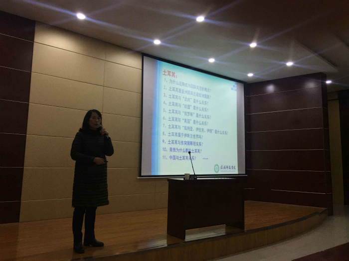 王义民教授从土耳其转身、连接欧亚大陆的地理位置及能源重地、历史文化渊源、土耳其的转身对世界地缘政治的影响、中国的机遇与挑战五个方面生动详细的阐述了土耳其在世界地缘政治中的重要地位。通过向学生分析土耳其转身的背景,使大家清楚土耳其的历史发展脉络,通过详细的讲解土耳其在不同时期同周边国家及所在组织成员国之间的关系,使学生能够了解土耳其在世界政治舞台的重要性和转变趋势。王义民教授幽默风趣的讲解活跃了讲座气氛,她与现场师生们展开了积极的讨论和交流。