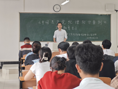 学生第二党支部书记甘玉锋要求全体学生党员要对《中国共产党纪律处分条例》进行系统的学习,认真做好笔记,撰写学习心得体会。要以更高的标准、更严的纪律要求自己,通过不断学习和践行,切实增强纪律意识和规矩意识。
