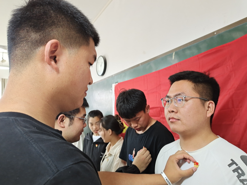 老党员为新党员佩戴党员徽章。老党员亲手为我戴上党员徽章,这不仅是红色精神的传承,更是对我们的殷殷期盼。作为年轻一代,我们肩负着建设祖国的重任。我会不负嘱托,脚踏实地为实现“中国梦”贡献青春力量。