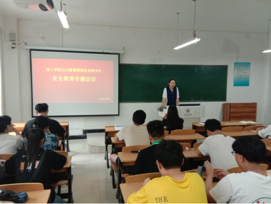 7月2日下午,在理工楼302教室召开理工学院2018级暑期留校考研学生安全教育专题会议。会议由学工秘书杨晓杰主持,参会人员有理工学院党总支副书记张红梅、18级班级辅导员徐国文、颜欢、以及全体留校考研学生。
