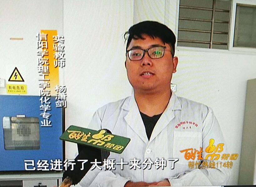9月13日上午10点,理工学院化学实验室教师杨潇剑接受了信阳电视台百姓帮帮团的采访。