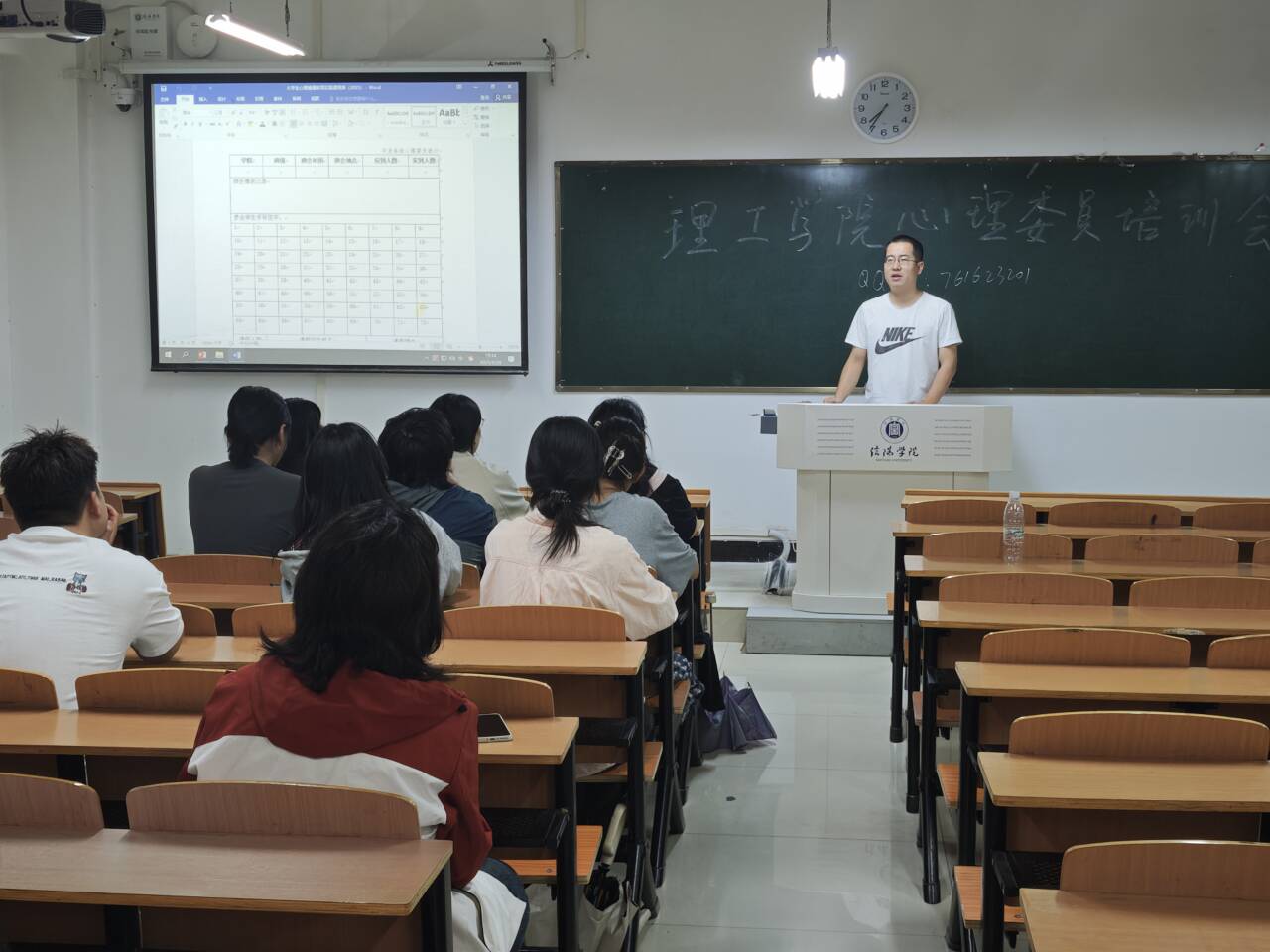 为科普心理健康知识,提升大学新生对心理健康教育的关注度,9月29日晚,理工学院在理工楼402教室开展2025级心理委员培训会。理工学院心理辅导站站长甘玉锋作专题培训,全体2025级心理委员参加了培训。