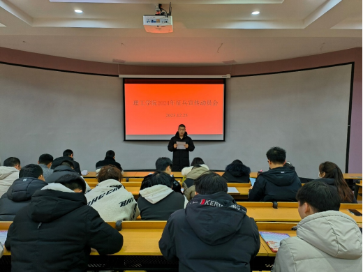 为帮助学生更好地了解征兵政策,鼓励大学生积极投身军营报效祖国,激发同学们参军入伍的热情。12月25日,理工学院于理工楼116教室举行了2024年征兵动员会。理工学院学工秘书杨晓杰、全体辅导员老师、2020级全体男生和低年级部分学生代表参加了动员会。