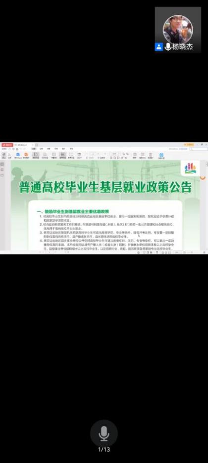 为提高我院毕业生就职面试成功率,更好的促进学生就业。4月28日下午,理工学院学工秘书杨晓杰通过腾讯会议为2022届毕业生做了毕业生就业创业政策宣讲。2018级全体毕业生参加了培训。