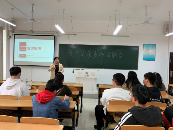 智游集团郭老师首先通过视频和PPT的形式向同学们展示了智游集团的体系结构,企业文化。然后,郭老师给同学们介绍招聘岗位、岗位职责、薪资待遇、福利等,同学们根据自己要求进行提问,郭老师针对学生提出的问题一一做解答。