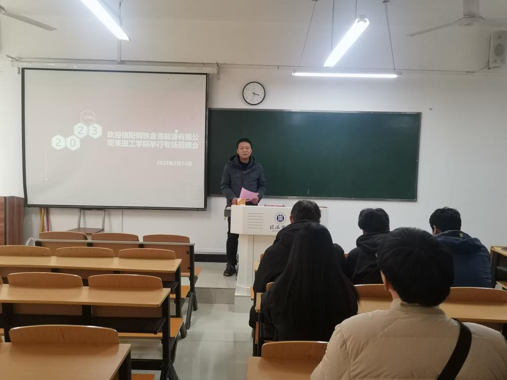 2月14日下午,理工学院在理工楼303教室举行专场招聘会,河南金马能源股份有限公司与信阳钢铁金港能源有限公司举行现场人才招聘活动,2019级化学、机电专业毕业生参加了招聘会。