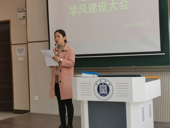 党总支副书记张红梅作总结发言。她指出学风是一所学校的灵魂,学风建设是一所大学永恒的话题。学风建设一直是学院的工作重点。此次学风建设动员大会意义重大,让今后的学风建设活动更具体、更有成效。她希望广大学生一定要牢记使命,肩负起职责,好好学习,对自己负责、对家人负责、不负家人的期许。