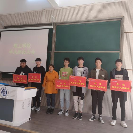 全体辅导员教师为各年级创建学风建设先进班集体学生代表颁发创建牌。