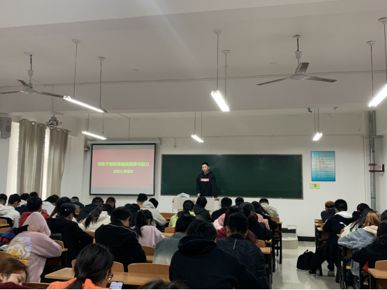 徐国文老师围绕学生干部应具备的素质与能力方面展开培训,首先,徐国文老师提出学生干部应具备思想政治素质、业务素质、心理素质、集体素质,他特别强调学生干部要有集体利益至上观念。接着他又提出了学生干部应具有较强的沟通能力、分析、判断和应变能力、决策能力、组织和个体感染能力、创新能力传达,帮助带动能力。其中,徐国文老师强调分析判断和应变能力极为重要,并解释了传带帮能力的意义传带帮分别为传达,带动和帮助,对学生干部在能力和管理方面做出合理的分析。最后,徐国文老师又提出四个素质,分别是思想政治素质,业务素质,心理素质和集体素质并总结学生干部怎样培养能力与素质,为学生干部工作起到关键性作用。最后徐国文老师特别强调学生干部一定要事先组织好语言,才能进行更好的与同学,老师进行有效沟通。